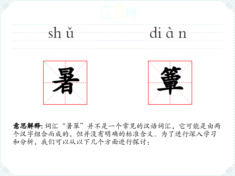 词汇“暑箪”并不是一个常见的汉语词汇,它可能是由两个汉字组合而成的,但并没有明确的标准含义。为了进行深入学*和分析,我们可以从以下几个方面进行探讨: