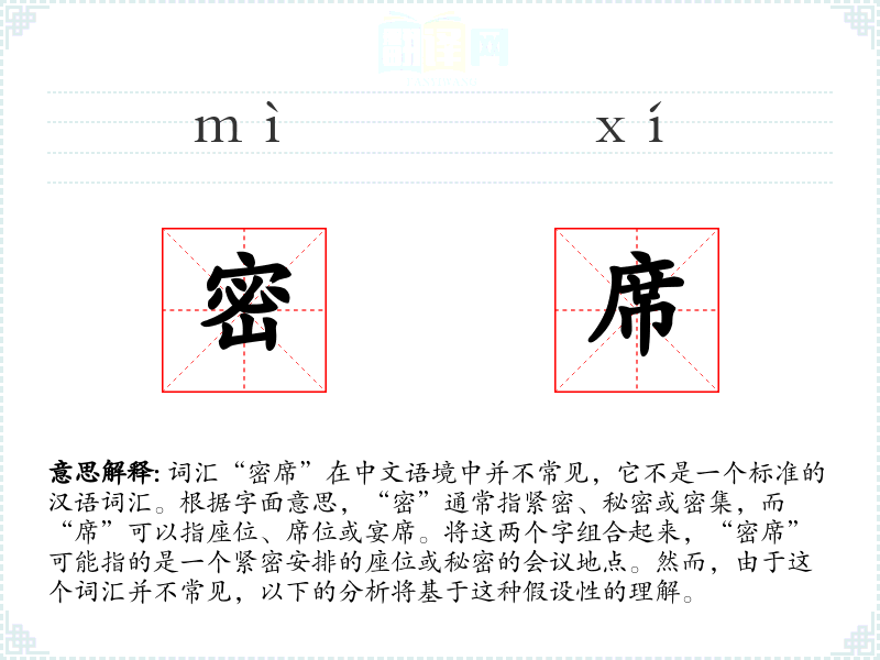 词汇“密席”在中文语境中并不常见,它不是一个标准的汉语词汇。根据字面意思,“密”通常指紧密、秘密或密集,而“席”可以指座位、席位或宴席。将这两个字组合起来,“密席”可能指的是一个紧密安排的座位或秘密的会议地点。然而,由于这个词汇并不常见,以下的分析将基于这种假设性的理解。