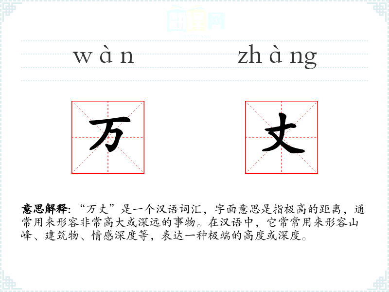- 专业领域:在建筑学或地理学中,“万丈”可能用来描述建筑物的极高或山脉的极深。