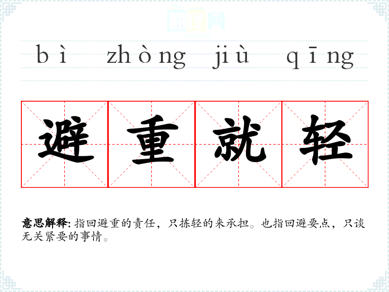 指回避重的责任,只拣轻的来承担。也指回避要点,只谈无关紧要的事情。