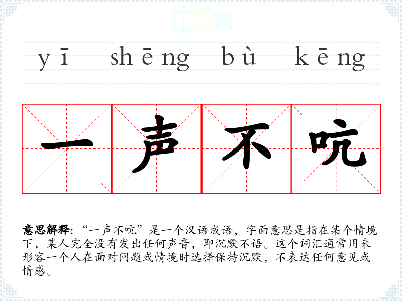 “一声不吭”是一个汉语成语,字面意思是指在某个情境下,某人完全没有发出任何声音,即沉默不语。这个词汇通常用来形容一个人在面对问题或情境时选择保持沉默,不表达任何意见或情感。