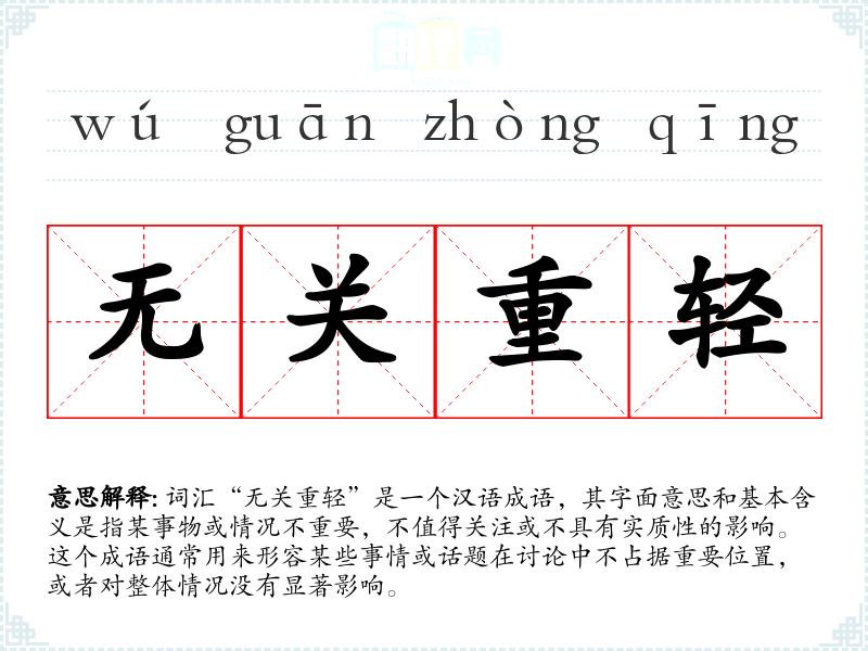 词汇“无关重轻”是一个汉语成语,其字面意思和基本含义是指某事物或情况不重要,不值得关注或不具有实质性的影响。这个成语通常用来形容某些事情或话题在讨论中不占据重要位置,或者对整体情况没有显著影响。