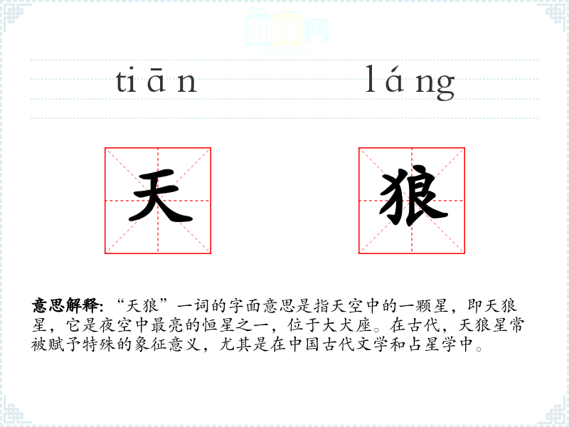 “天狼”这个词不仅是一个天文学术语,也是一个充满文化内涵的词汇。它在文学、历史和日常生活中都有着重要的地位。通过对“天狼”的学*和分析,我更加理解了词汇的多重意义和文化价值。