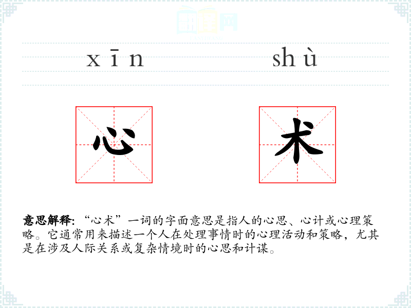 “心术”一词的字面意思是指人的心思、心计或心理策略。它通常用来描述一个人在处理事情时的心理活动和策略,尤其是在涉及人际关系或复杂情境时的心思和计谋。
