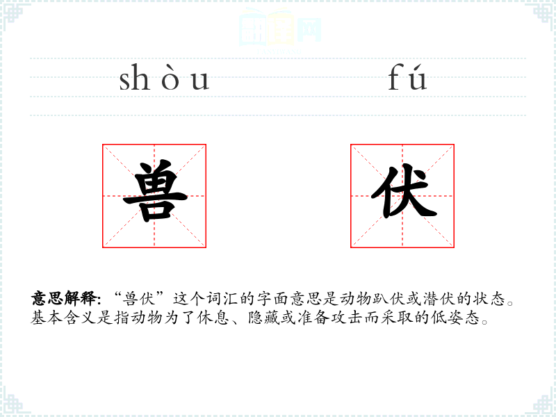 “兽伏”由“兽”和“伏”两个字组成。“兽”指动物,“伏”指趴下或潜藏。这个词在古代汉语中已有使用,主要用于描述动物的行为,后来也用于比喻人的某些行为。
