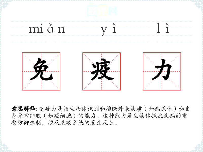 在不同语言中,如英语(immunity)、西班牙语(inmunidad)和法语(immunité),免疫力这个词的基本含义相似,都指生物体的防御能力。
