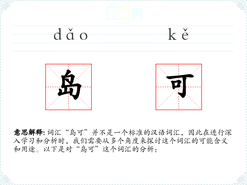 总的来说,“岛可”这个词汇虽然不是一个标准词汇,但它提供了一个有趣的视角来探讨词汇的创造性和象征性使用。在语言学习和表达中,它提醒我们词汇的灵活性和多样性。