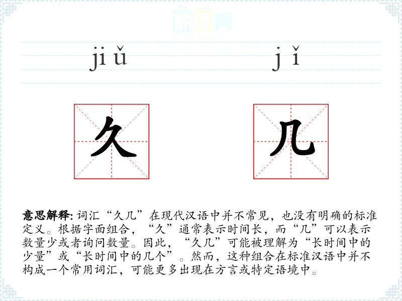 由于“久几”不是一个标准词汇,我们无法提供一个确切的基本定义。它可能是一个方言词汇,或者在特定社群中使用的术语。