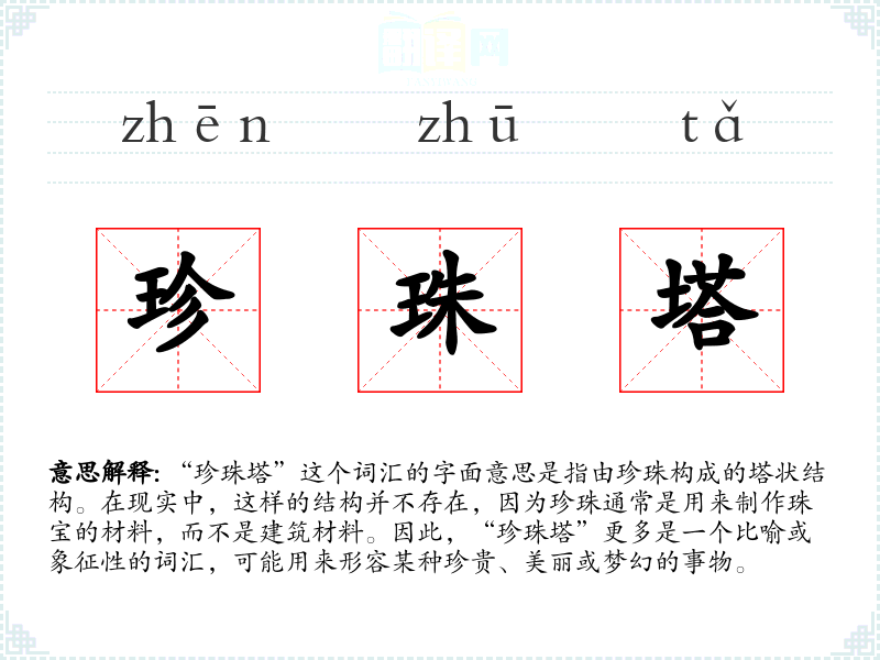 - 专业领域:在珠宝行业,可能会有“珍珠塔”这样的设计概念,指的是一种由多层珍珠组成的装饰品。
