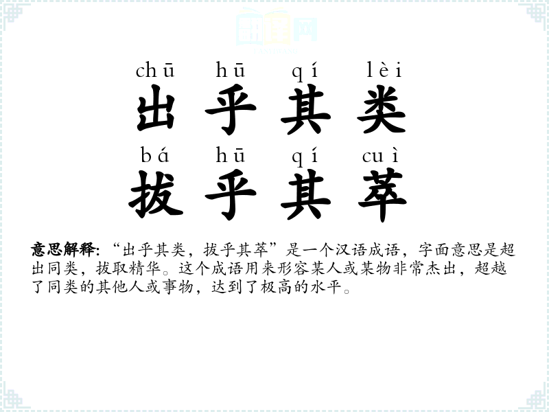 这个成语出自《孟子·公孙丑上》:“出乎其类,拔乎其萃,自生民以来,未有盛于孔子也。”原意是赞美孔子的伟大,后来泛指在某一领域中非常杰出的人或事物。