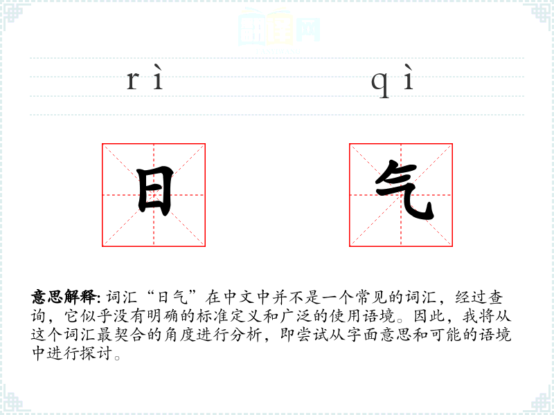 “日气”字面意思可能是指“日”(太阳)的“气”(气息、气氛),即太阳的气息或气氛。然而,这个词汇在中文中并不常见,也没有明确的定义。