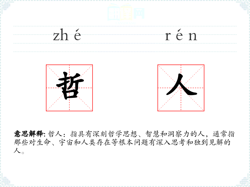哲人:指具有深刻哲学思想、智慧和洞察力的人,通常指那些对生命、宇宙和人类存在等根本问题有深入思考和独到见解的人。