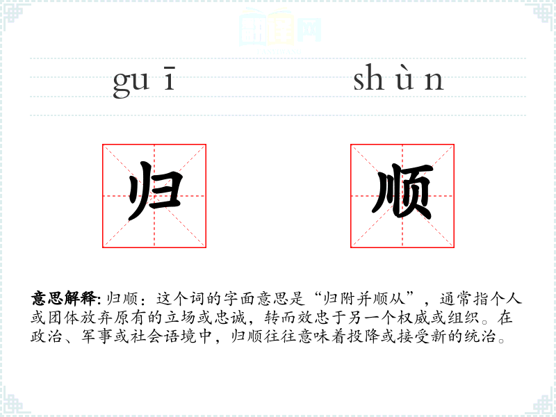 归顺:这个词的字面意思是“归附并顺从”,通常指个人或团体放弃原有的立场或忠诚,转而效忠于另一个权威或组织。在政治、军事或社会语境中,归顺往往意味着投降或接受新的统治。