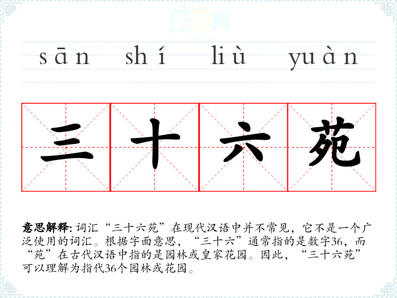 词汇“三十六苑”在现代汉语中并不常见,它不是一个广泛使用的词汇。根据字面意思,“三十六”通常指的是数字3,而“苑”在古代汉语中指的是园林或皇家花园。因此,“三十六苑”可以理解为指代3个园林或花园。