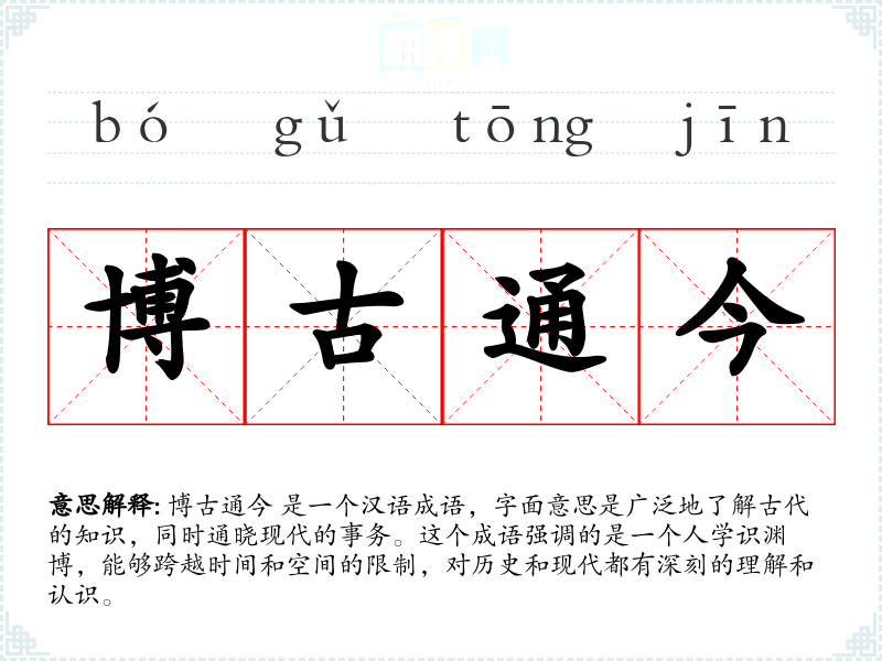 博古通今 是一个汉语成语,字面意思是广泛地了解古代的知识,同时通晓现代的事务。这个成语强调的是一个人学识渊博,能够跨越时间和空间的限制,对历史和现代都有深刻的理解和认识。