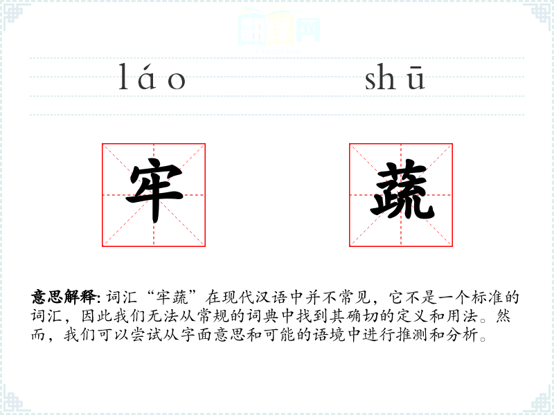 词汇“牢蔬”在现代汉语中并不常见,它不是一个标准的词汇,因此我们无法从常规的词典中找到其确切的定义和用法。然而,我们可以尝试从字面意思和可能的语境中进行推测和分析。