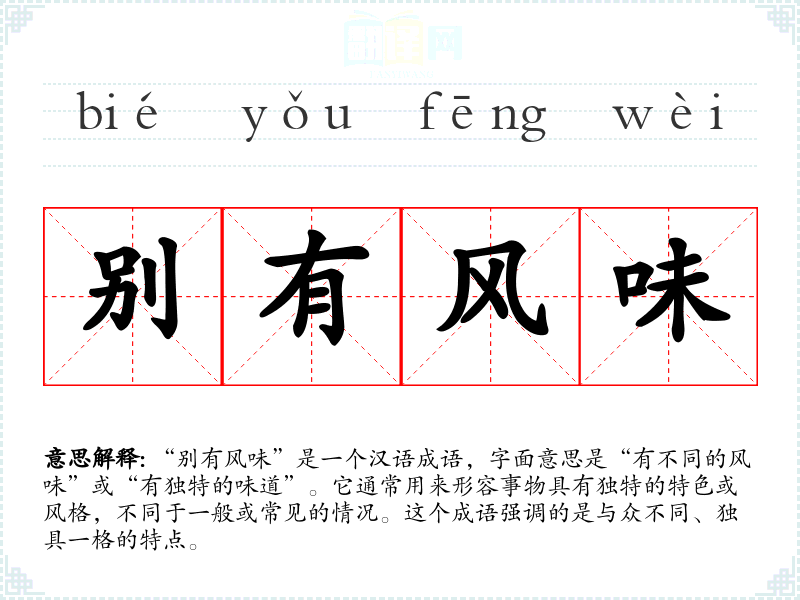 “别有风味”是一个汉语成语,字面意思是“有不同的风味”或“有独特的味道”。它通常用来形容事物具有独特的特色或风格,不同于一般或常见的情况。这个成语强调的是与众不同、独具一格的特点。