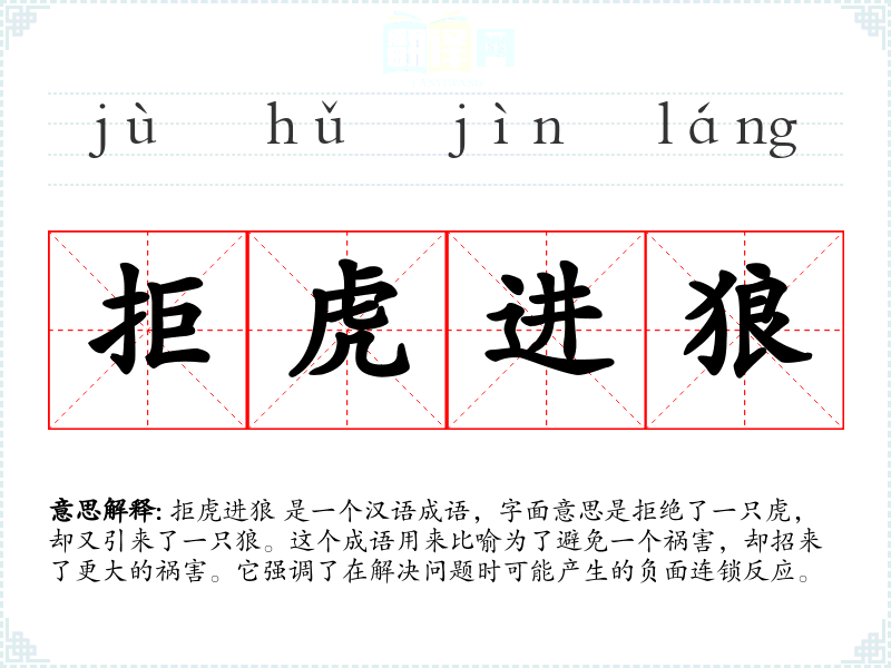 拒虎进狼 是一个汉语成语,字面意思是拒绝了一只虎,却又引来了一只狼。这个成语用来比喻为了避免一个祸害,却招来了更大的祸害。它强调了在解决问题时可能产生的负面连锁反应。