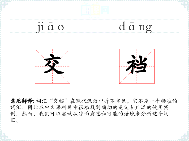 由于“交档”不是一个常用词汇,它在不同语言或文化中的对应词汇及其使用情况不详。