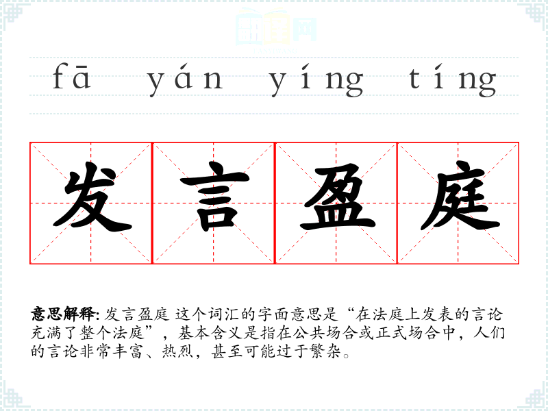 发言盈庭 这个词汇的字面意思是“在法庭上发表的言论充满了整个法庭”,基本含义是指在公共场合或正式场合中,人们的言论非常丰富、热烈,甚至可能过于繁杂。