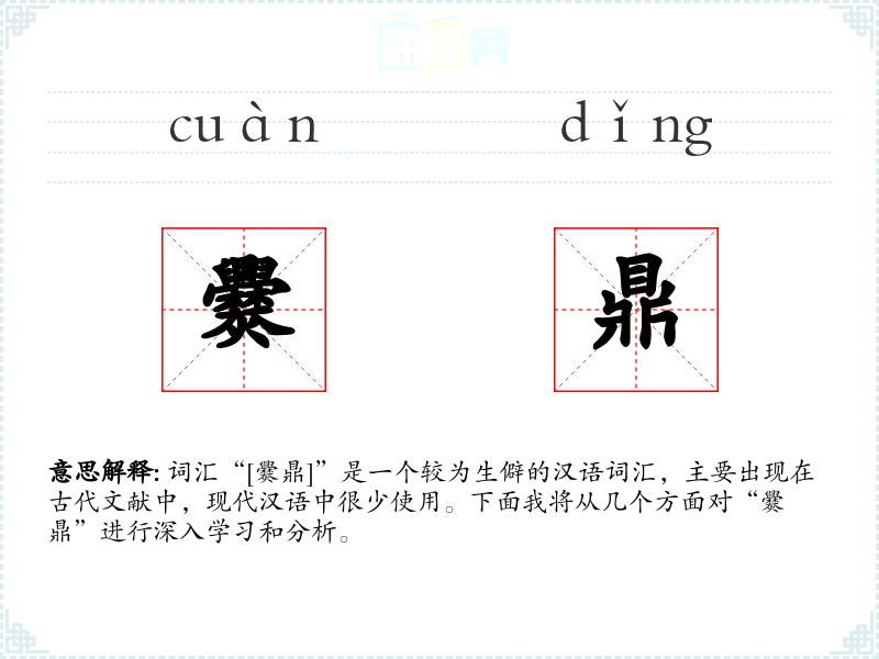 词汇“[爨鼎]”是一个较为生僻的汉语词汇,主要出现在古代文献中,现代汉语中很少使用。下面我将从几个方面对“爨鼎”进行深入学*和分析。