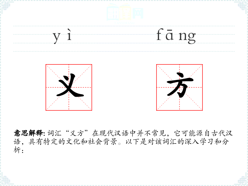 词汇“义方”在现代汉语中并不常见,它可能源自古代汉语,具有特定的文化和社会背景。以下是对该词汇的深入学*和分析: