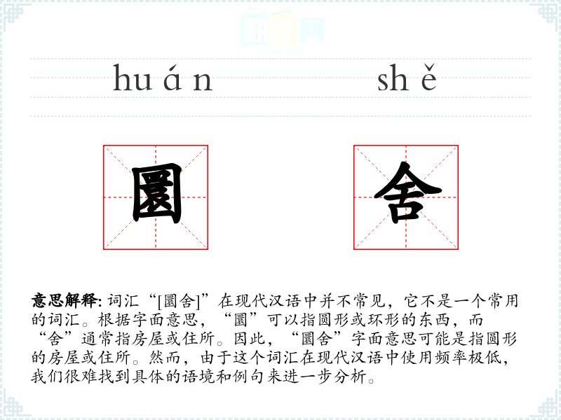 词汇“[圜舍]”在现代汉语中并不常见,它不是一个常用的词汇。根据字面意思,“圜”可以指圆形或环形的东西,而“舍”通常指房屋或住所。因此,“圜舍”字面意思可能是指圆形的房屋或住所。然而,由于这个词汇在现代汉语中使用频率极低,我们很难找到具体的语境和例句来进一步分析。