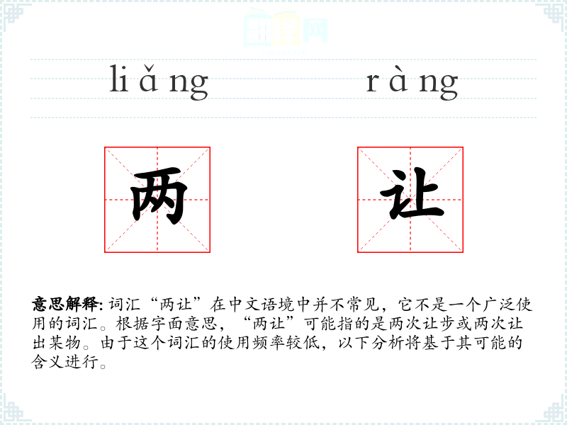 词汇“两让”在中文语境中并不常见,它不是一个广泛使用的词汇。根据字面意思,“两让”可能指的是两次让步或两次让出某物。由于这个词汇的使用频率较低,以下分析将基于其可能的含义进行。
