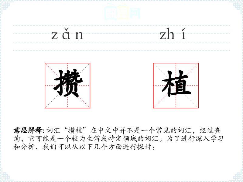 词汇“攒植”在中文中并不是一个常见的词汇,经过查询,它可能是一个较为生僻或特定领域的词汇。为了进行深入学习和分析,我们可以从以下几个方面进行探讨: