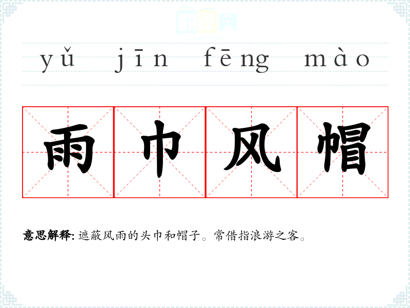 遮蔽风雨的头巾和帽子。常借指浪游之客。