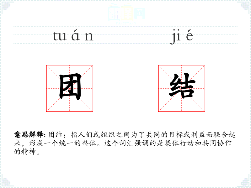 团结:指人们或组织之间为了共同的目标或利益而联合起来,形成一个统一的整体。这个词汇强调的是集体行动和共同协作的精神。