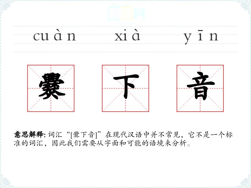 词汇“[爨下音]”在现代汉语中并不常见,它不是一个标准的词汇,因此我们需要从字面和可能的语境来分析。