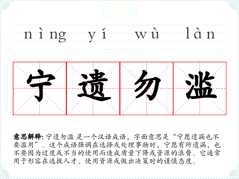 宁遗勿滥 是一个汉语成语,字面意思是“宁愿遗漏也不要滥用”。这个成语强调在选择或处理事物时,宁愿有所遗漏,也不要因为过度或不当的使用而造成质量下降或资源的浪费。它通常用于形容在选拔人才、使用资源或做出决策时的谨慎态度。