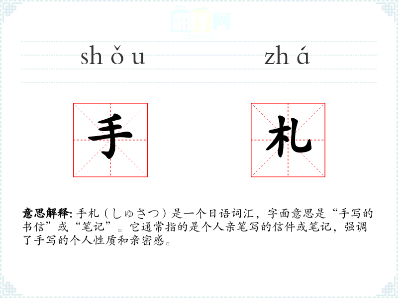 手札(しゅさつ)是一个日语词汇,字面意思是“手写的书信”或“笔记”。它通常指的是个人亲笔写的信件或笔记,强调了手写的个人性质和亲密感。