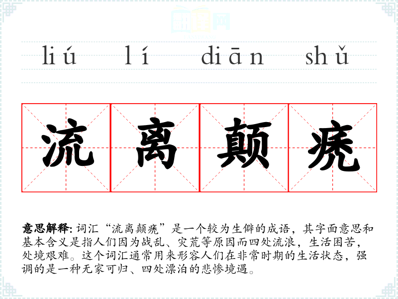 词汇“流离颠痜”是一个较为生僻的成语,其字面意思和基本含义是指人们因为战乱、灾荒等原因而四处流浪,生活困苦,处境艰难。这个词汇通常用来形容人们在非常时期的生活状态,强调的是一种无家可归、四处漂泊的悲惨境遇。