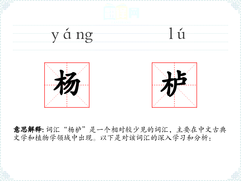 词汇“杨栌”是一个相对较少见的词汇,主要在中文古典文学和植物学领域中出现。以下是对该词汇的深入学*和分析: