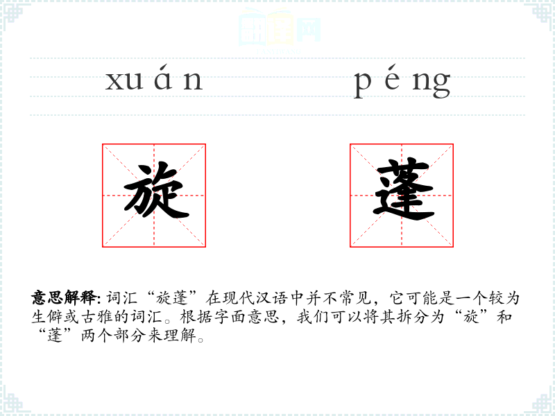 词汇“旋蓬”在现代汉语中并不常见,它可能是一个较为生僻或古雅的词汇。根据字面意思,我们可以将其拆分为“旋”和“蓬”两个部分来理解。