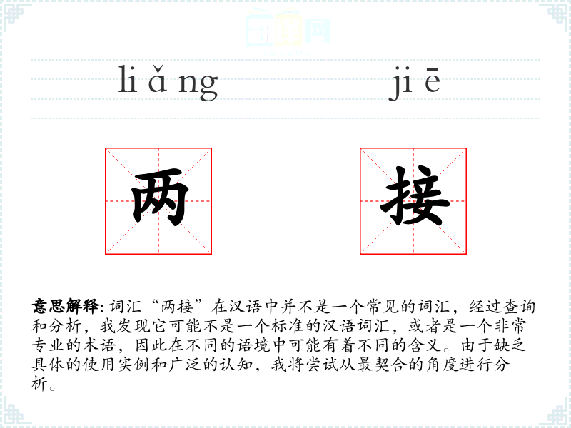 由于“两接”不是一个常见的词汇,我们无法给出一个确切的基本定义。它可能是某个特定领域或方言中的术语,或者是某种特定语境下的表达。