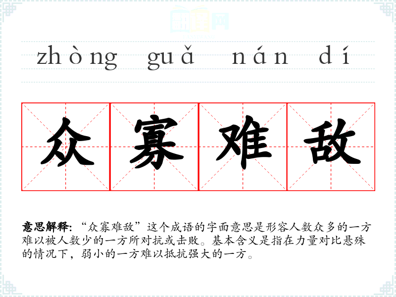 “众寡难敌”这个成语的字面意思是形容人数众多的一方难以被人数少的一方所对抗或击败。基本含义是指在力量对比悬殊的情况下,弱小的一方难以抵抗强大的一方。