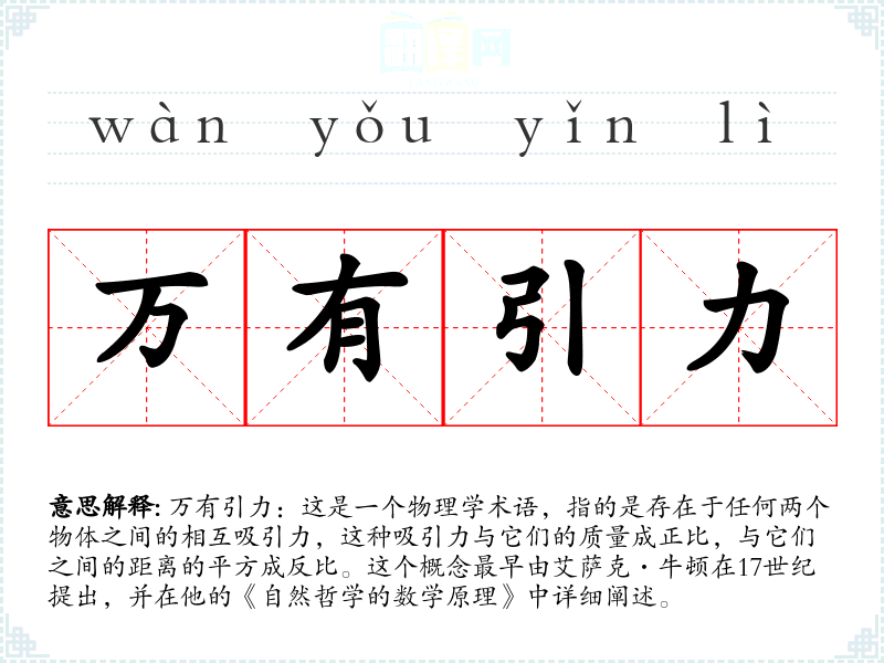 万有引力:这是一个物理学术语,指的是存在于任何两个物体之间的相互吸引力,这种吸引力与它们的质量成正比,与它们之间的距离的平方成反比。这个概念最早由艾萨克·牛顿在17世纪提出,并在他的《自然哲学的数学原理》中详细阐述。