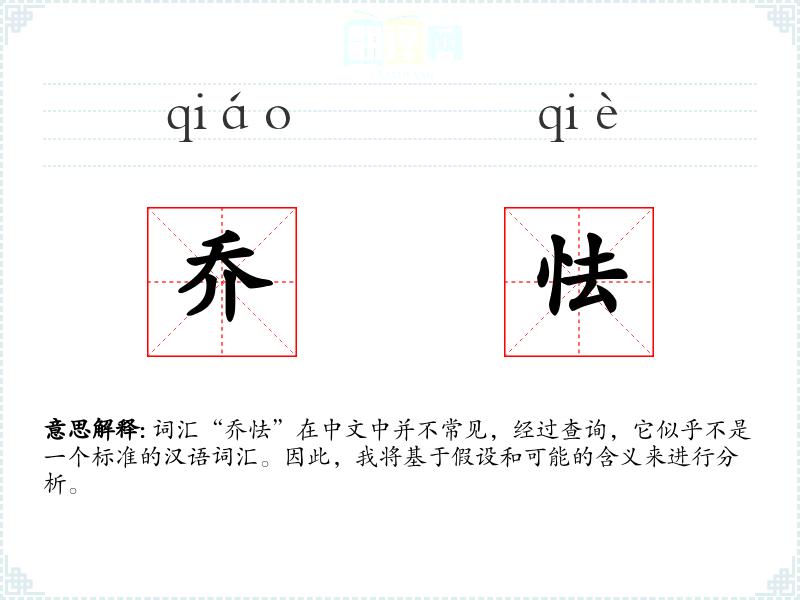 词汇“乔怯”在中文中并不常见,经过查询,它似乎不是一个标准的汉语词汇。因此,我将基于假设和可能的含义来进行分析。