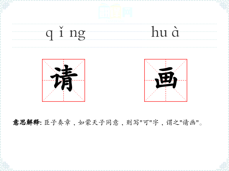 臣子奏章﹐如蒙天子同意﹐则写"可"字﹐谓之"请画"。