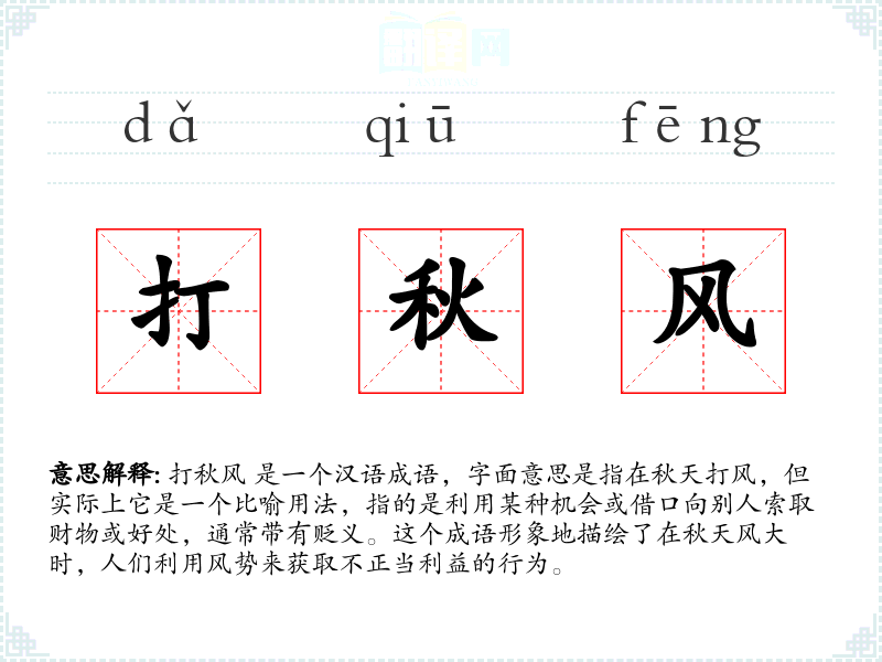 打秋风 是一个汉语成语,字面意思是指在秋天打风,但实际上它是一个比喻用法,指的是利用某种机会或借口向别人索取财物或好处,通常带有贬义。这个成语形象地描绘了在秋天风大时,人们利用风势来获取不正当利益的行为。