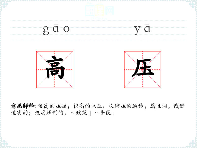 较高的压强;较高的电压;收缩压的通称;属性词。残酷迫害的;极度压制的:~政策|~手段。