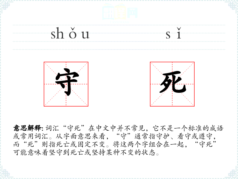 词汇“守死”在中文中并不常见,它不是一个标准的成语或常用词汇。从字面意思来看,“守”通常指守护、看守或遵守,而“死”则指死亡或固定不变。将这两个字组合在一起,“守死”可能意味着坚守到死亡或坚持某种不变的状态。