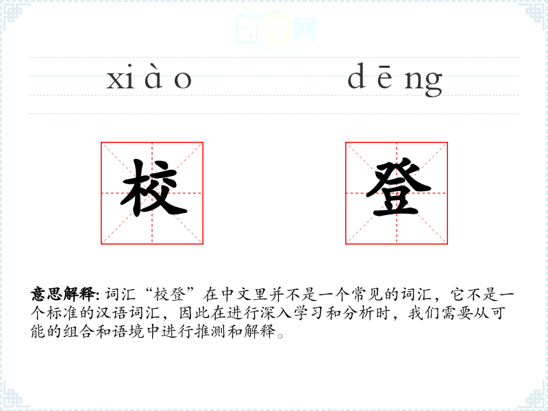 词汇“校登”在中文里并不是一个常见的词汇,它不是一个标准的汉语词汇,因此在进行深入学习和分析时,我们需要从可能的组合和语境中进行推测和解释。