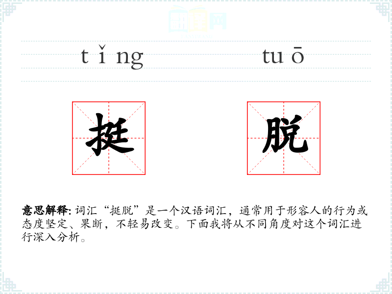 “挺脱”字面意思是指坚定不移,不轻易屈服或改变。在现代汉语中,它常用来形容一个人在面对困难或压力时,能够坚持自己的立场或决定,表现出一种坚强和果断的态度。