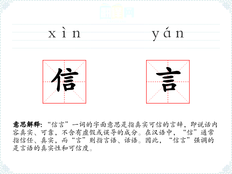 “信言”一词的字面意思是指真实可信的言辞,即说话内容真实、可靠,不含有虚假或误导的成分。在汉语中,“信”通常指信任、真实,而“言”则指言语、话语。因此,“信言”强调的是言语的真实性和可信度。