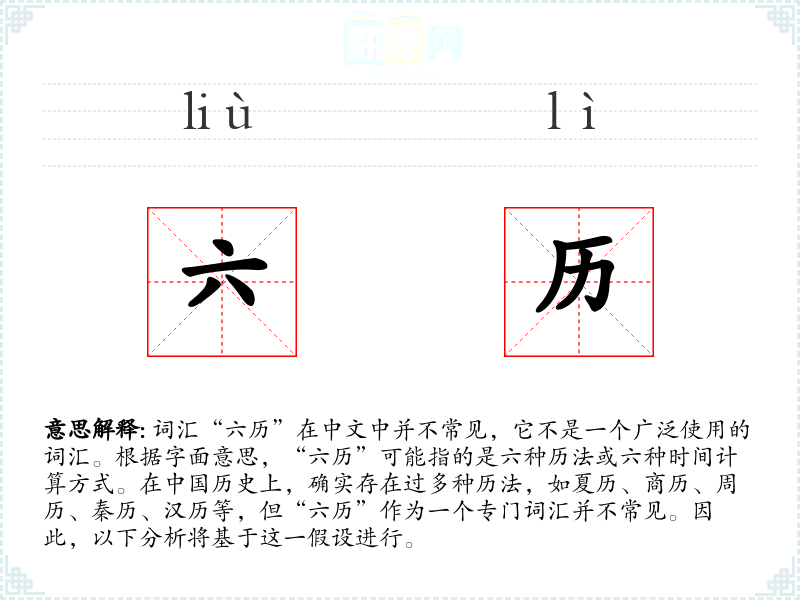 词汇“六历”在中文中并不常见,它不是一个广泛使用的词汇。根据字面意思,“六历”可能指的是六种历法或六种时间计算方式。在**历史上,确实存在过多种历法,如夏历、商历、周历、秦历、汉历等,但“六历”作为一个专门词汇并不常见。因此,以下分析将基于这一假设进行。