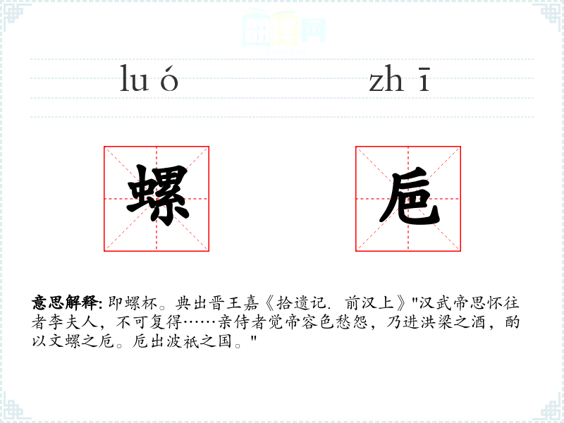 即螺杯。典出晋王嘉《拾遗记.前汉上》"汉武帝思怀往者李夫人,不可复得……亲侍者觉帝容色愁怨,乃进洪梁之酒,酌以文螺之卮。卮出波祇之国。"
